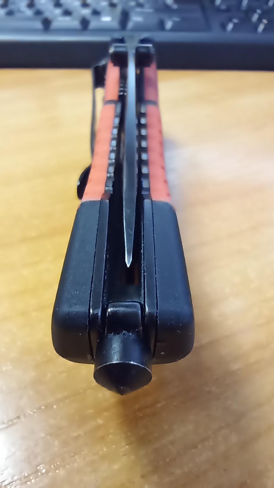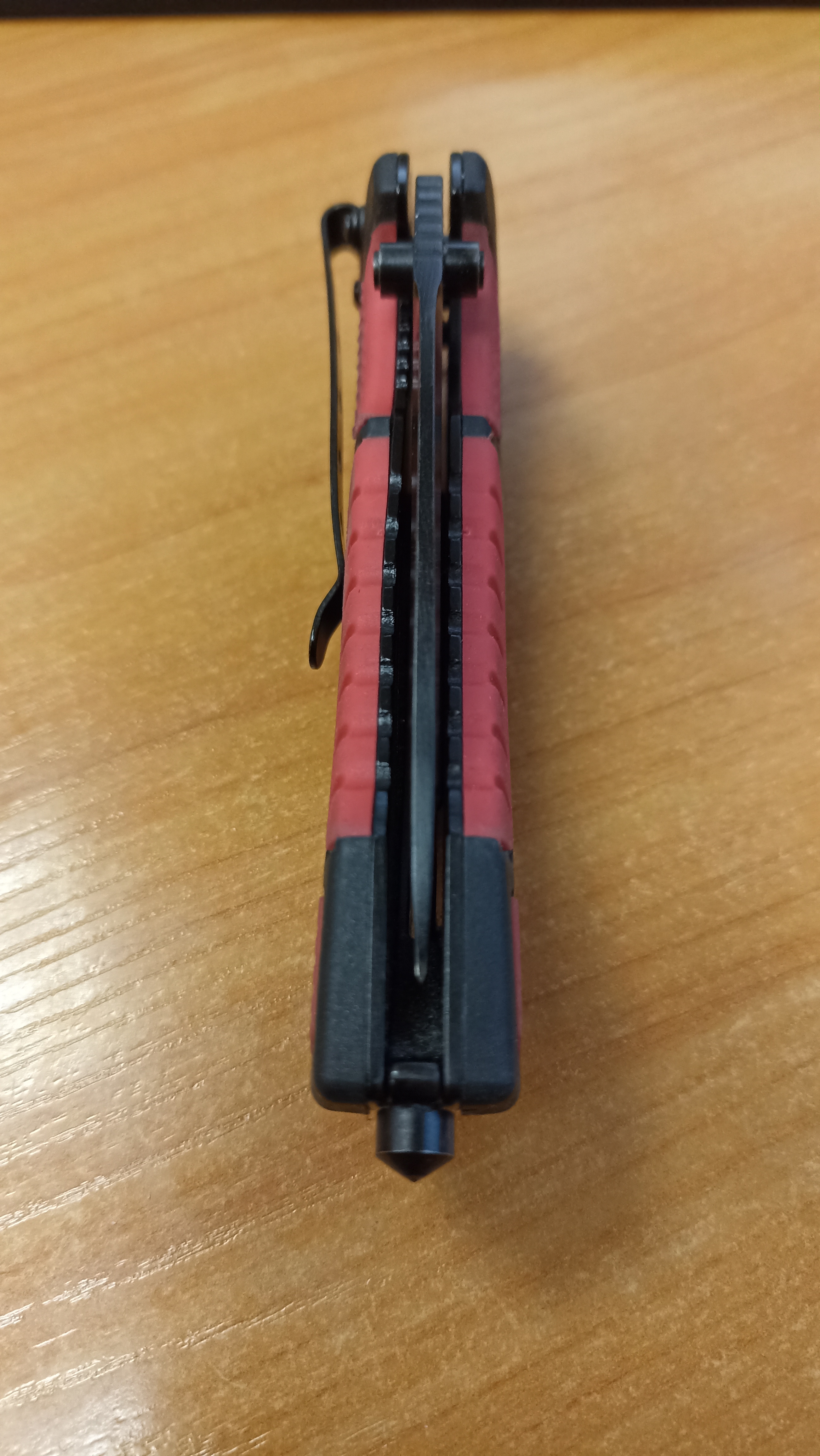 Прорезиненная ручка даёт уверенный хват, как просто в ладони, так и в перчатках, и в мокрых руках. Ничего не скользит. Но из-за того, что ношу в кармане, за клипсу, на этих резиновых элементах уже начинает проступать синий цвет от джинсовой ткани. Понятно, что всё это вытирается, убирается. Но во-первых, это означает, что надо следить за внешним видом ножа (если конечно он вам важен), а во-вторых, от частой протирки эта резиновая часть сама будет облазить, стираться, и приходить в не очень презентабельный вид.