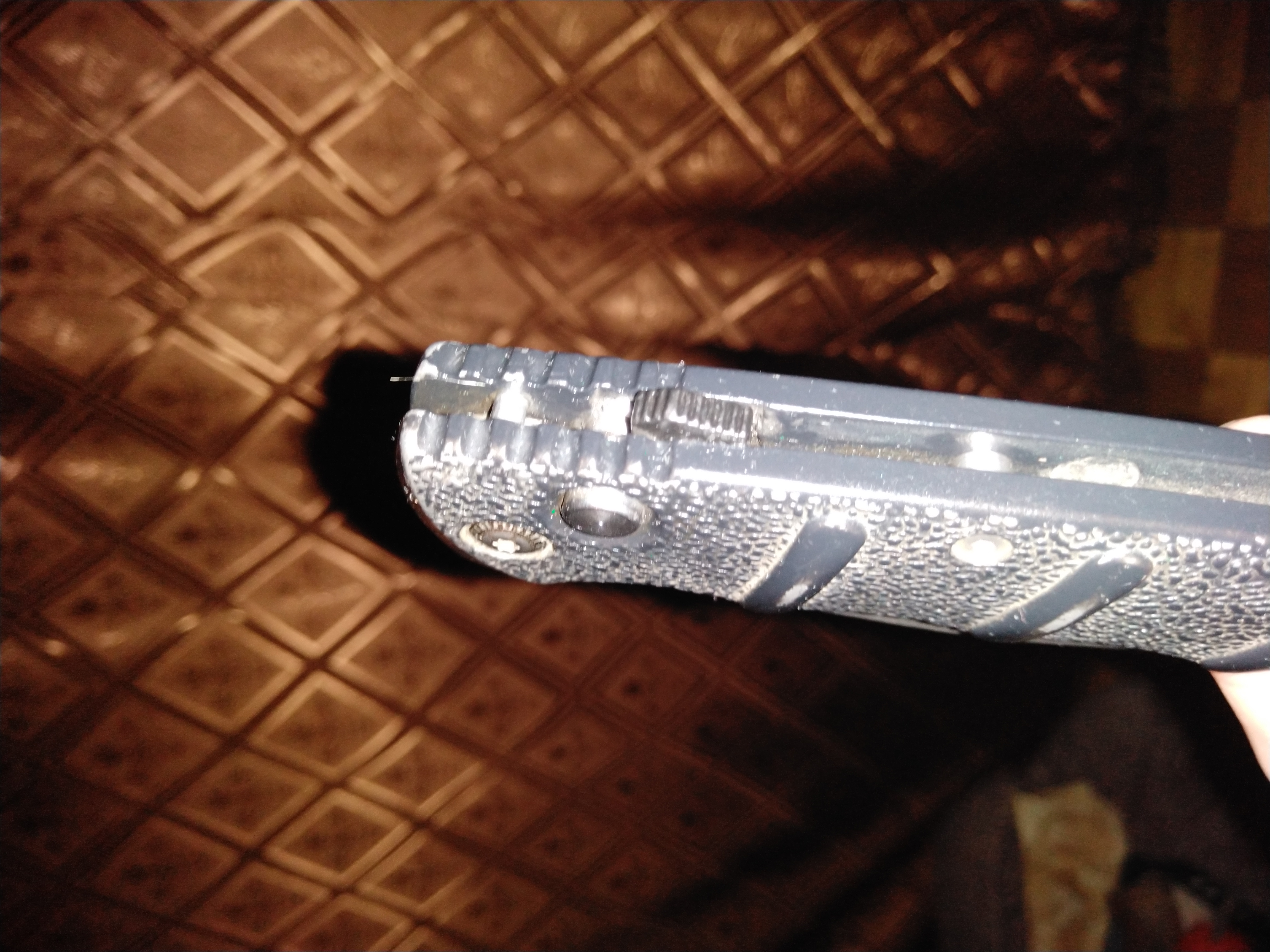 Точу на наждаке. Нет правильной формы кромки, т.е. пятка отсутствует, поэтому приходится стачивать основание,т.е. цепляя алюминевую рукоять.
